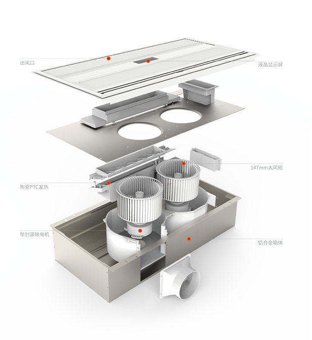 陶瓷PTC加熱,通過不斷循環來提高浴室溫度,送熱極為均勻。2700W大功率, 雙核動力,高制熱量系統設計,使發熱效率更高,熱損耗更低。高制熱,快速溫暖空間, 不僅讓您暢享沐浴時光,即便在洗漱更衣區也可享受溫暖。